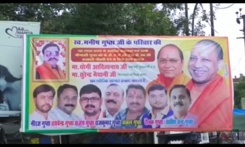 के धन्यवाद वाली होर्डिंग ही लगा दी। हैरानी की बात ये है कि अभी मनीष को मरे दस दिन भी नहीं हुए है और उसको सरकारी सहयता मिले पांच दिन भी नहीं हुए है। केडीए में ओएसडी की नौकरी लगने का अभी कोई फ़ाइनल लेटर भी नहीं मिला है। सहायता की कौन कहे अभी घरवालों के गमो के आशु भी बंद नहीं हुए है लेकिन मनीष के घर के पास वैश्य समाज के कुछ नेताओ ने सरकार की चापलूसी में सहायता की होर्डिंग लगवाकर उनके जख्मो पर अपनी राजनीति का नमक छिड़क दिया है। इस होर्डिंग में सीएम योगी के साथ क्षत्रिय विधायक सुरेंद्र मैथानी के फोटो लगाकर पत्नी को सरकार द्वारा दिए गए चालीस लाख की सहायता और केडीए में ओएसडी की नौकरी देने के लिए उनका धन्यवाद दिया गया है।चौराहे पर लगी यह होर्डिंग चर्चा का विषय बन गई है। इस होर्डिंग को देखने वाले भी होर्डिंग में पत्नी की सहायता का जिक्र करने को गलत मान रहे है।वही इस पूरे मामले पर विधायक सुरेंद्र मैथानी का कहना है की मेंरे संज्ञान में होर्डिंग नहीं है। मनीष मेरे क्षेत्र के थे इसलिए उनके परिवार के प्रति मेरी जिम्मेवारी थी। सीएम जी ने भी खुद अपनी तरफ से उनसे मिलने की इच्छा जताई थी। इस तरह की होर्डिंग लगाना गलत है मै इसका पता लगा करके लगवाने वालो से उसको हटाने के लिए कहूंगा।