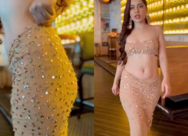 उर्फी ने स्किन कलर का टॉप और स्कर्ट पहनी हुई है।
