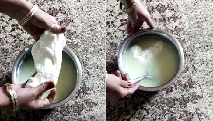 महिला ने जब फटे दूध को बाहर निकाला तो वह हैरान रह गई. फटा दूध रबर की तरह तन गया और च्युइंग गम की तरह नजर आने लगा. महिला इस दूध को रबर की तरह तानते हुए दिख रही है. इस दूध को महिला मोहल्ले की एक डेयरी से खरीदती थी. ये लूज पॉलीथिन में मिलता था. इस दूध को ये काफी समय से इस्तेमाल कर रही थीं.