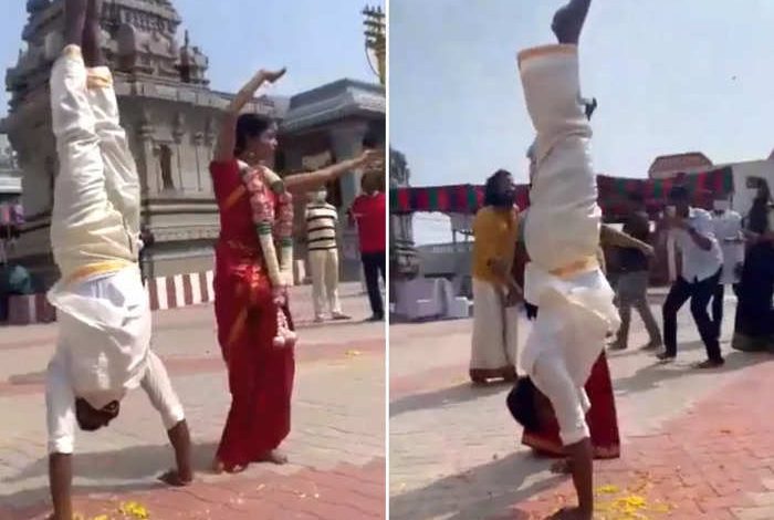 वो पैरों की जगह अपने हाथों के बल खड़ा नजर आ रहा है। जबकि दुल्हन लगातार अपने पोज बदल रही है। सच में, इतनी देर क्या… पलभर के लिए भी किसी आम इंसान के लिए फोटोशूट के लिए ऐसा पोज देना मुमकिन ही नहीं है। तो वहीँ, इस ‘प्री वेडिंग’ शूट को देखकर कई लोगों ने मजेदार प्रतिक्रिया दी है। प्रतिक्रिया देते हुए एक यूजर ने पूछा कि दूल्हे की लुंगी क्यों नीचे नहीं आई?