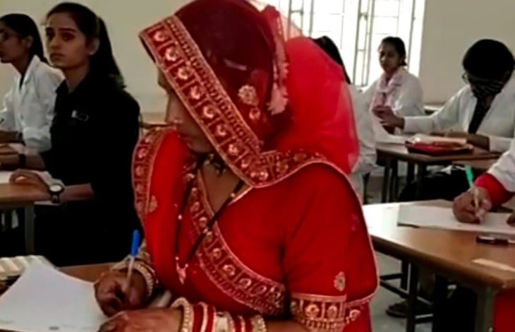 विदाई के बाद शादी के जोड़े में परीक्षा देने पहुंची दुल्हन पति ने परीक्षा केंद्र के बाहर किया पत्नी का इंतज़ार